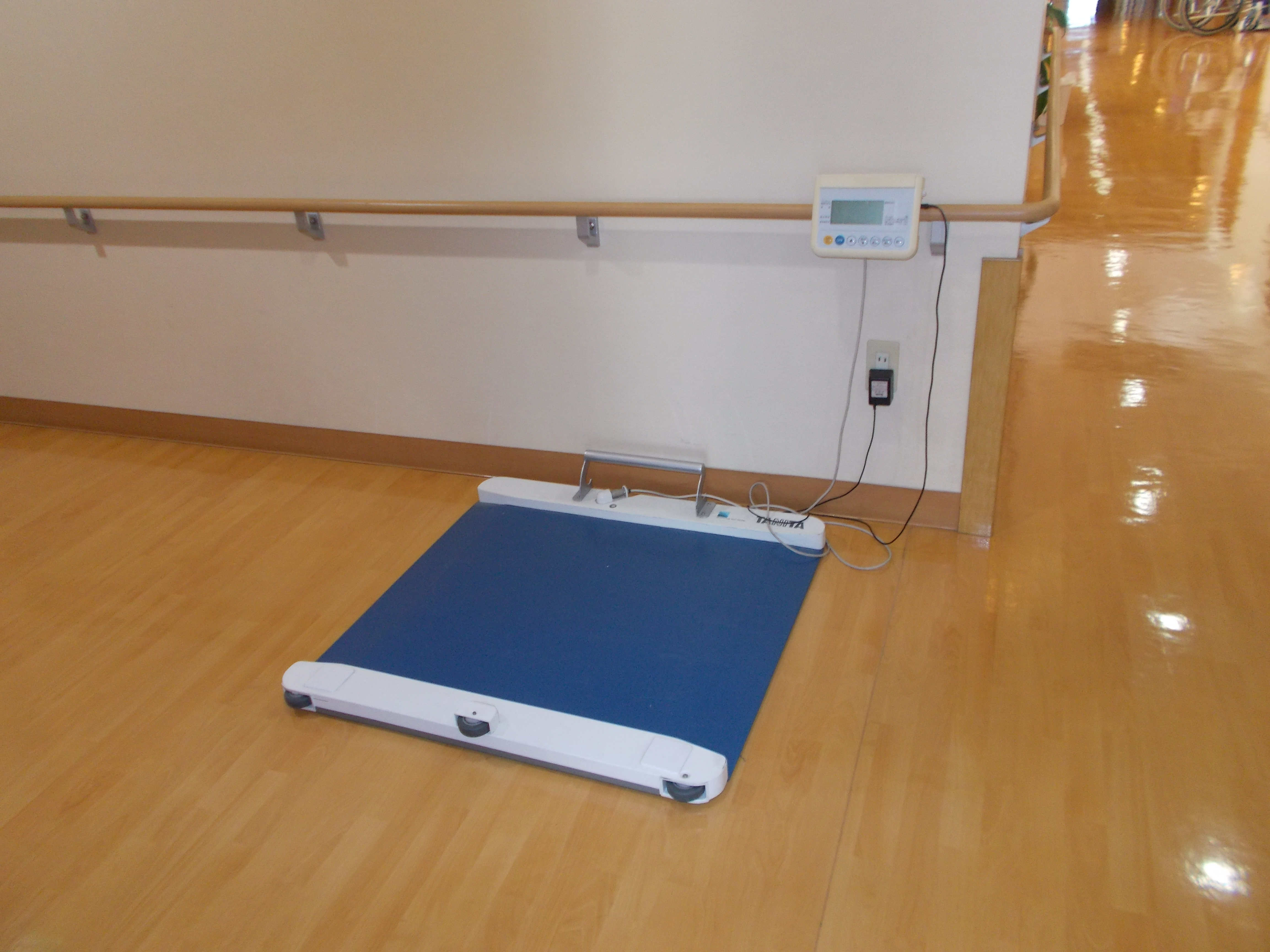 車椅子のまま体重測定 くつろげる空間のリビングには車椅子で体重測定が可能になります。(そんぽの家 東静岡)